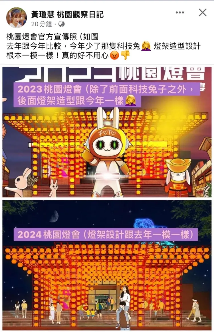 民進黨桃園市議員黃瓊慧臉書發文表示,2024年燈會將於2/21至3/3在南昌營區、虎頭山創新園區舉辦,總預算4900萬,但張善政市府的桃園燈會官方宣傳照,去年、今年比一比,今年少了那隻鄭文燦市府的那隻「科技兔」,可是燈架造型設計根本一模一樣,她怒批觀旅局真的很不用心。