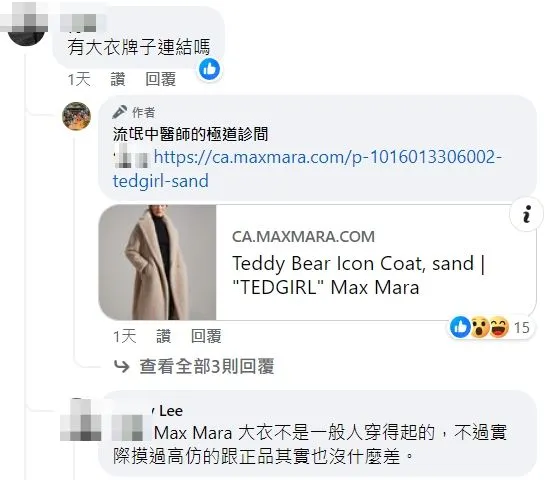 臉書「流氓中醫師的極道診間」發文透露,他看完貴婦奈奈受訪的內容後,身為一個住在安省大多倫多近20年的居民,他心中第一個想法:「妳ㄊㄇ再唬爛一點!🙄」記者在超市拍到貴婦奈奈時,她穿的那件大衣大概10萬台幣左右,如果是正品的話。他還在留言處貼出疑似該大衣,是MaxMara的Teddy Bear Icon Coat(泰迪熊大衣),品牌官網註明售價30100人民幣,換算售價逾10萬台幣,目前已售罄。