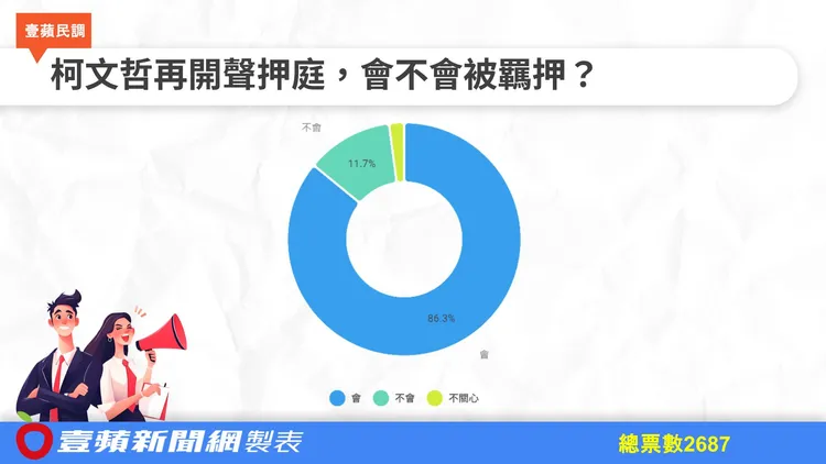《壹蘋新聞網》進行線上民調,「柯文哲再開聲押庭,這次會不會被羈押?」,民調進行至9月5日11:00截止。總投票人數為2687人,認為柯文哲「會」被羈押的網友佔86.3%,票數為2321票;認為柯文哲「不會」被羈押的的比例僅有11.7%,人數為317人;而另有49人對於柯文哲會不會被羈押表示「不關心」,比例約占1.8%。