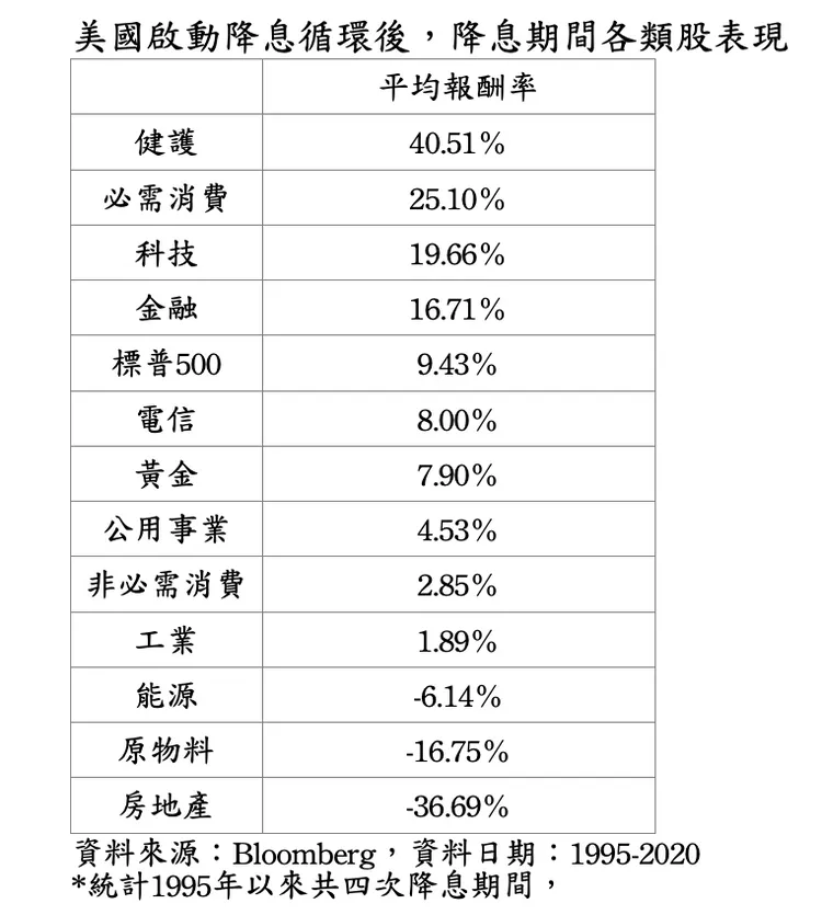 統計自1995年以來美國四次降息循環,S&P500指數平均報酬率9.43%,其中健康護理、必須消費及科技表現最佳,平均報酬分別達0.51%、25.1%及19.66%,顯示降息對股市產生正面影響。此外,當降息導致定存等固定收益回報下降時,投資人會轉尋求潛在報酬率更高的選擇,有利股市後勢。