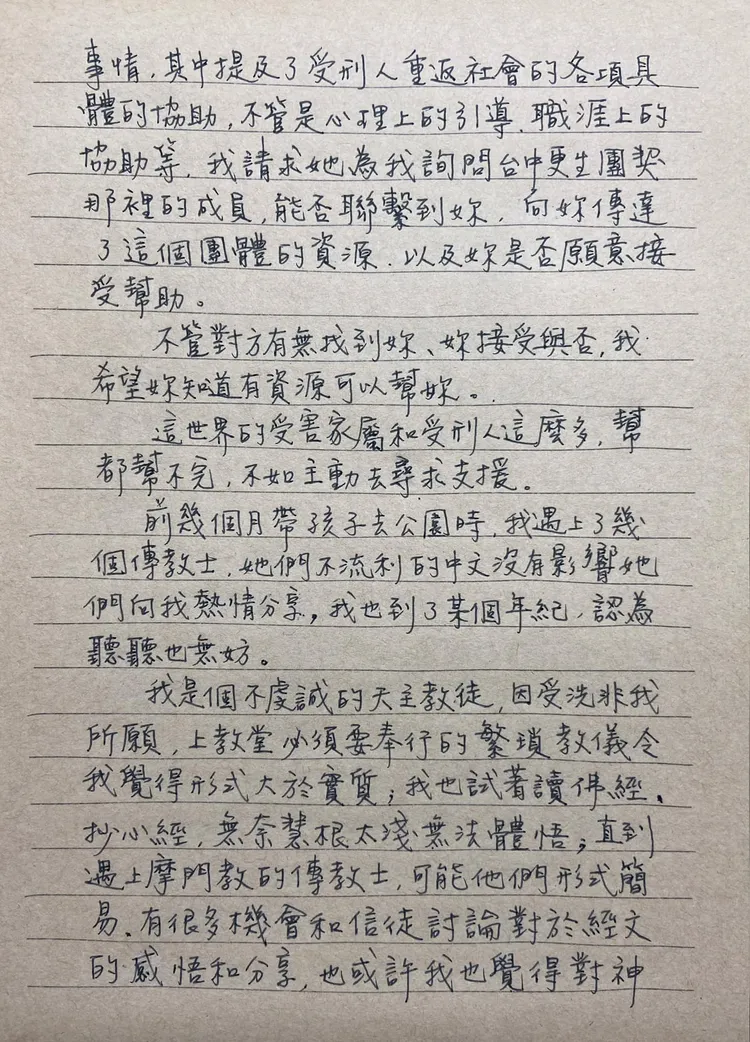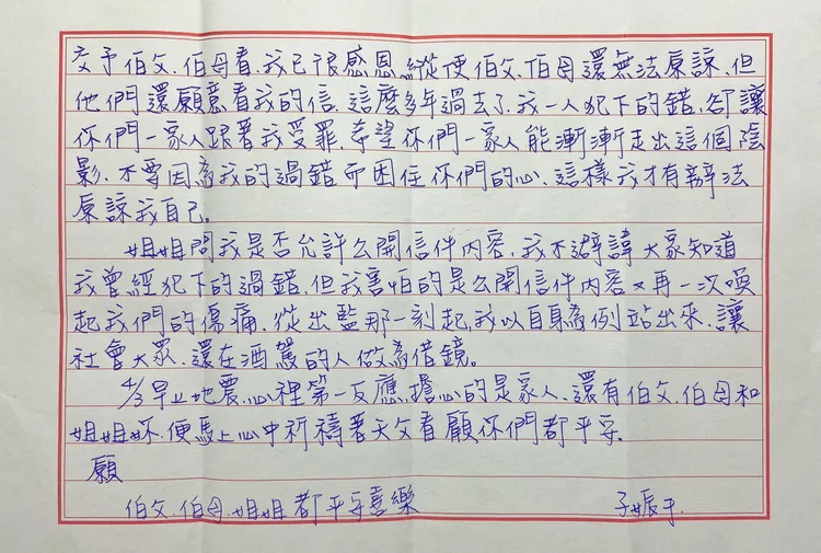 死者姊姊表示,如果顏女繼續走回頭路,對她們而言無疑是白痛了這幾年、也替帥主廚不值。她好,這個社會也會好。因此她在寫給顏女的信件中,除了提及自己的近況,也分享與更生團契成員接觸過程,並提供更生團契資源,希望可以幫助顏女。