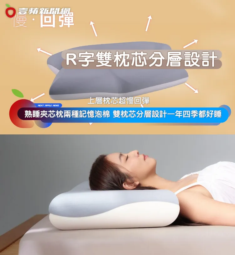 熟睡夾芯枕採用R字雙枕芯分層設計,融合兩種記憶泡棉,上層枕芯超慢回彈,下層記憶棉能有效支撐,在枕套的部分材質也有所不同,採用雙面枕套,一面冬天睡的暖心材質,另一面則適合悶熱的夏天的冰鋒材質,不僅四季適用,還能提供最佳的支撐力,無論是仰睡還是側睡都舒適,睡眠品質當然就更好囉。