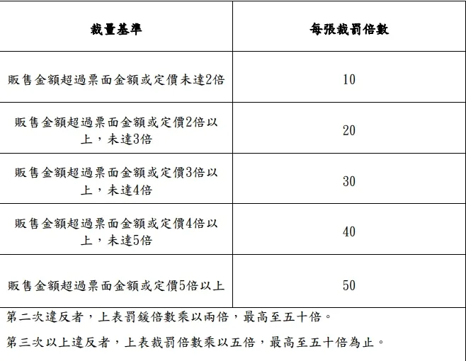 《文化創意產業發展法》修法於2023年6月2日生效,販售金額超過票面金額或定價未達2倍,裁罰10倍票券罰金;販售金額超過票面金額或定價2倍以上,未達3倍,裁罰20倍票券罰金;販售金額超過票面金額或定價3倍以上,未達4倍,裁罰30倍罰金;販售金額超過票面金額或定價4倍以上,未達5倍,裁罰40倍票券罰金;販售金額超過票面金額或定價5倍以上,裁罰50倍票券罰金。累犯者還會加重處罰。