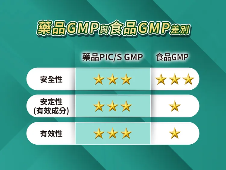 「藥品GMP」與「食品GMP」差別*1:藥廠GMP製程管控更為嚴謹,不僅重視「安全性」,同時也須確保「安定性」與「有效性」;而食品GMP則主要著重於「安全性」。