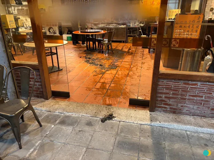 該男進入店內後,隨即將桶內液體朝一樓座位區地板潑灑,黑色黏稠液體瞬間在大廳蔓延,惡臭味道瞬間散發開來,面對突如其來的舉動,現場工作人員及顧客都嚇傻了。
