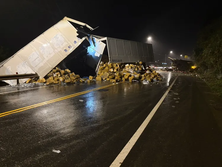 據了解,昨天深夜10時許賴姓女子(34歲)載著蔬菜沿台2線往基隆方向前進,不料經過105.5K處時竟突然偏移撞上護欄,接著再被對向朝宜蘭方向行駛的陳姓曳引車駕駛撞上(35歲),強大衝擊力除造成賴女車輛受損外,陳男曳引車所搭載的貨櫃更是當場翻覆。