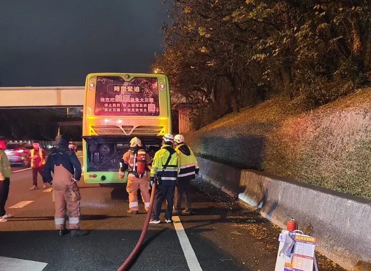 新竹市消防局表示,今天晚間19時57分據報國道一號南下96.3K新竹路段發生遊覽車冒煙起火,經派遣人車到場後,火勢已熄滅,遊覽車司機表示,係引擎室機油噴出來,溫度高冒煙,他立即停靠路肩熄火,由於引擎室溫度仍高,隨後由警消佈一水線降溫。