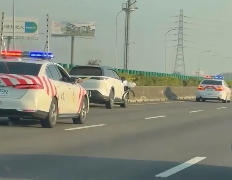 根據網友拍下的畫面,1輛 LUXGEN N7電動車行駛在國道內側車道,緩緩前進,右後方1輛紅斑馬國道警車,員警不斷從車窗揮手示意對方停車,但電動車一下靠右偏,一下靠左偏,此時前方又出現另輛警車擋在電動車的前方,此時車頭已嚴重受損的電動車,不斷擦撞左側護側,仍無停車跡象,看得網友心驚膽跳。