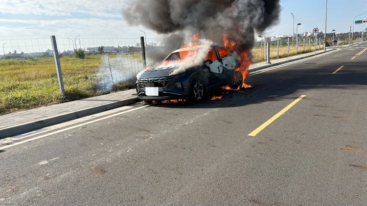 台南市消防局今天上午8時59分接獲報案,善化區善美七路和善福大道的交叉路口,有一輛汽車起火。消防人員派出人車前往灌救,發現這輛停放路邊的轎車,車輛已陷入火海全面燃燒。