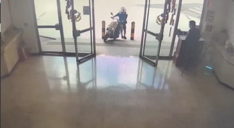 據了解,下午1時許吳男騎著一輛白色機車沿信二路逆向行駛,行經市警局門口時突然一個左彎朝大門衝去,穿過防撞桿撞上樓梯後才停下,門口警員不敢大意立刻喝斥吳男趴下,同時掏槍戒備。
