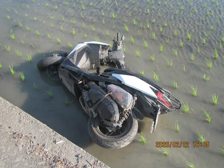 這起事故發生在昨天下午3時51分,1輛自小客車沿霧峰區丁台路往北岸路方向行駛,行經丁台路750號前不明原因撞擊黃姓男子(21歲)騎乘的機車,導致黃男連人帶車被撞進路邊的稻田內,全身多處擦挫傷,送醫治療。