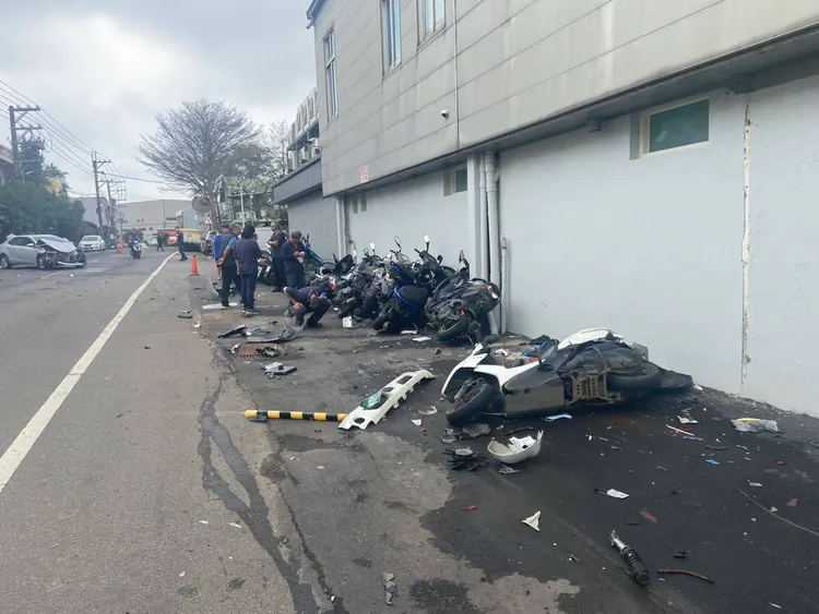 大園警分局表示,彭姓女子(56歲)今天上午10時許,駕駛自小客車沿觀音區富源六路行駛,欲左轉新富路時,與側向直行、由鄭姓男子(30歲)駕駛的小貨車發生碰撞,導致鄭男的小貨車往左偏移,撞上路邊停放的17輛汽、機車,現場無人傷亡,警方獲報到場處理,雙方駕駛均無酒駕情形,詳細肇事原因待後續調查釐清。