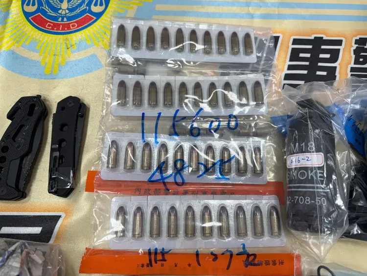 犯嫌開門等候友人之際,趁犯嫌尚未反應,埋伏警察快速衝入屋內控制犯嫌,當場緝捕並於屋內、桌上查獲子彈62顆、衝鋒槍彈匣2支、疑似煙霧彈2顆、疑似手榴彈4顆、火藥1包、匕首6把、斧頭1把、電擊棒1支、第三級毒品愷他命4包(毛重55功公克)、卡西酮咖啡包3包(11公克)、K盤3組、手機等證物,全案依槍砲彈藥刀械管制條例、毒品危害防制條例等罪移送臺灣高雄地方檢察署偵辦,張嫌經聲押後裁定10萬交保。