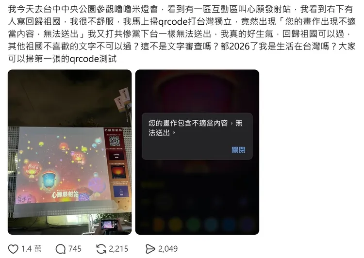 有網友Threads發文,表示昨晚去中央公園參觀嚕嚕米燈會,在心願發射站看到有人寫「回歸祖國」,他很不舒服,我馬上掃碼打「台灣獨立」,竟然出現「您的畫作出現不適當內容,無法送出」。