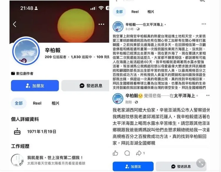 據了解,施男與家人同住,平時以務農維生,他稱是奉祀的神明託夢,告訴他辛柏毅還活著,於是將自己的臉書改名,還PO出多篇文章,稱要「相信媽祖婆、觀音菩薩」、「辛柏毅在第一次所畫搜救圖的東南方海面上」、「喝著雨水露水堅強活著」等語。
