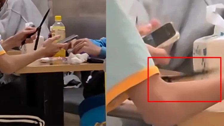 網友11日在桃園一家餐廳拍到,兩名國中生公然在餐桌前手拿折疊刀,其中一人接過之後,甚至朝面前座位「刺了一下」,隨後繼續耍完刀具,過程全被手機拍下。