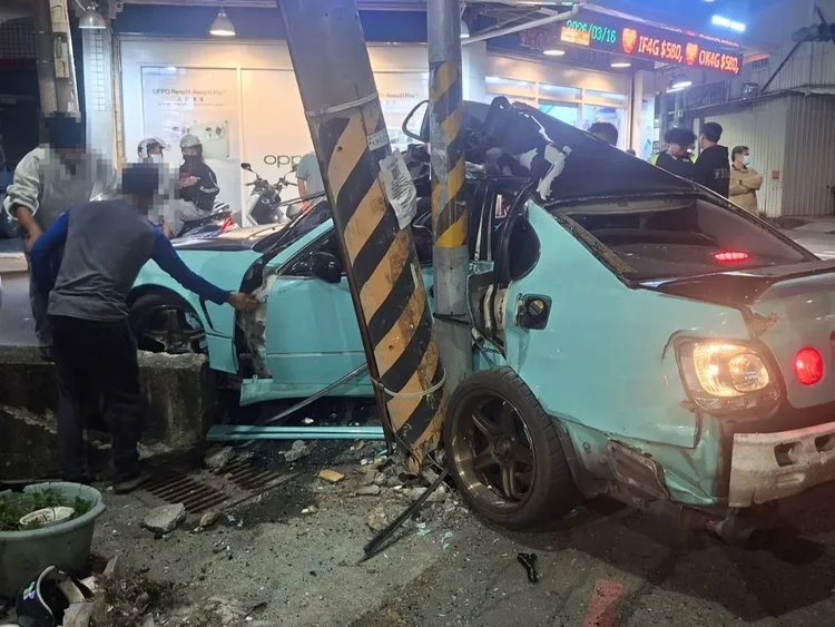 這輛小客車撞上路邊電線桿,連交通號誌也受損,造成周邊4至5戶住家停電,詳細肇事原因待調查釐清。
