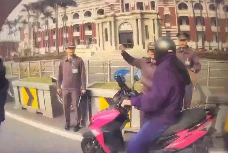 警方指出,上午9時許在統總府前守望的警力發現1名騎士騎車到重慶南、凱道路口,並在總統府前叫罵,但訴求不明,警方與憲兵立即將他圍住,,並將人車分離排除至人行道上避免發生危害。
