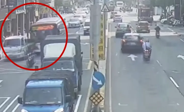 而在公車前方,42歲黃姓男子駕駛的小貨車,已提前打方向燈準備右轉進入中正路558巷,並逐漸減速。不料,疑似有機車因為有公車壓迫之下,試圖從右側超車,導致貨車被迫煞車停下,後方公車則疑似未及時注意前方狀況,直接追撞貨車。