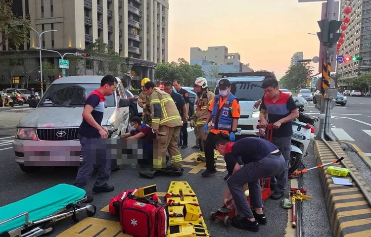 南市消防局25日下午6時許接獲報案,安平區永華路二段、育平路有車禍事故,有民眾受傷受困,立刻派遣人車馳援,到場時發現是廂型車撞上女性民眾,她倒地後遭廂型車左前輪輾過卡在車底,當下意識清醒,消防人員以起中工具抬起車身,將婦人送往醫院救治。