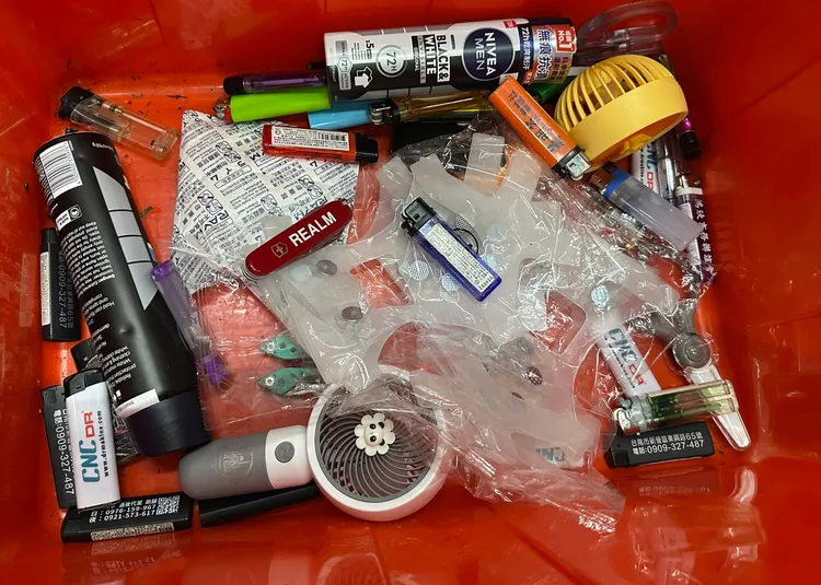 航警局呼籲出境旅客,行動電源、打火機、電子菸、藍芽耳機請勿託運,隨身行李攜帶液體不得超過100毫升,安檢前請先倒掉瓶內液體,並取出筆電、淨空口袋內物品、脫下外套、背心、帽子及皮帶等物品放入置物盒內受檢,以加速安檢作業。