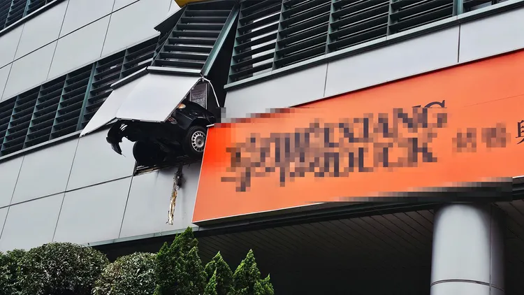 板橋分局1日上午11時50分接獲報案,指稱位於新北市縣民大道二段的台電大樓2樓停車場有車輛暴衝。警消獲報趕抵現場,發現一台轎車衝破停車場圍牆,前輪掛在牆外。