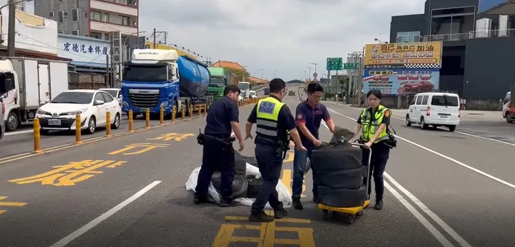 經確認掉落物為數個廢棄橡膠圈,路過民眾出借推車,熱心地與員警合力徒手搬移,迅速將障礙物移至路側,順利恢復交通順暢,還給用路人安全的行車環境。