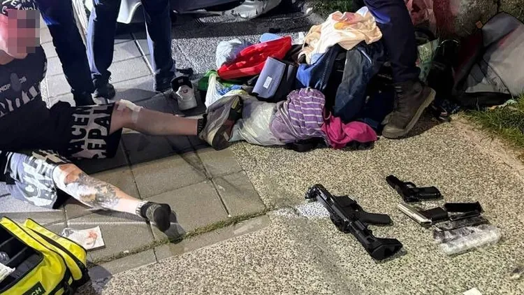 林男拒絕配合,倒車加速逃逸,過程中還撞上商家招牌。員警尾隨追捕,不到5分鐘就在興業西路附近巷弄逮捕林男、高男2名嫌犯,經警方附帶搜索,在車內查獲長槍1把、短槍2把、子彈67發、霰彈1顆、二級毒品依托咪脂等證物。