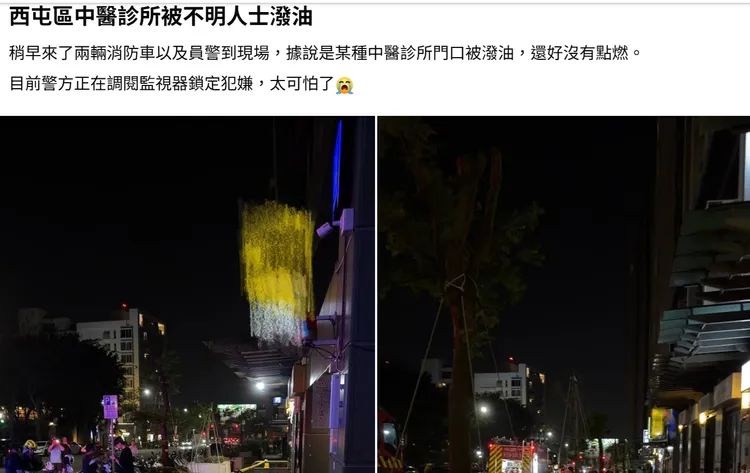 台中市警六分局前天晚間9時許接獲民眾報案,西屯區1家中醫診所前瀰漫刺鼻的汽油味。警方到場後立即實施人車管制,並通報消防局到場處置,所幸火勢沒點燃,沒有人員傷亡。附近民眾聞到汽油味還看到消防車到場,在地方臉書社團發文直呼「太可怕了」