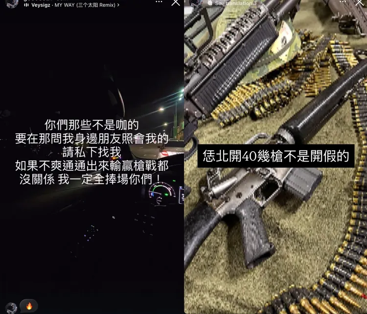 檢警調查,吳男去年11月時與人發生糾紛,拿著衝鋒槍北上桃園開槍威嚇,所幸是打在房子及轎車上,並未有人受傷,案件也由當地檢警偵辦中,但他怕事後遭到對方報復,去年12月底發布IG限時動態,留言「你們那些不是咖的…不爽出來輸贏」、「開40幾槍不是假的」,除了發文挑釁外,也有幾分壯膽的成分在。