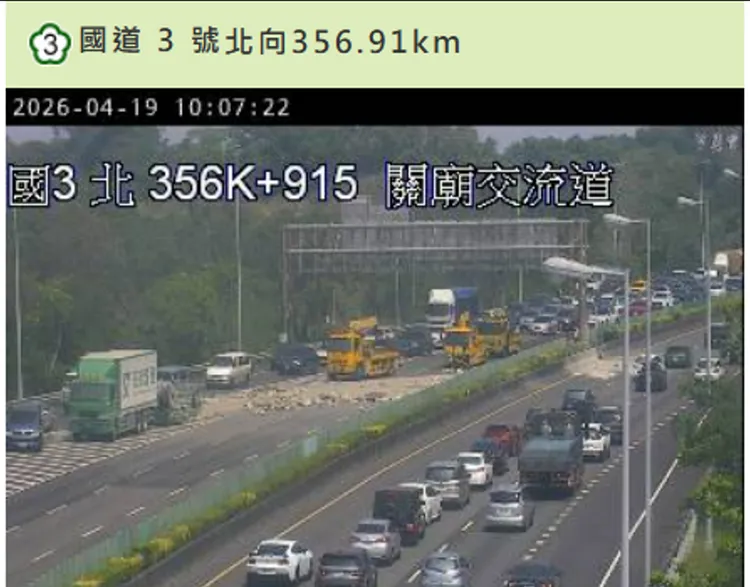 【記者凃建豐/台南報導】今(19)日9時52分於國道3號南向356.7公里處(關廟路段)發生交通事故案,陳男(82年次)駕駛全聯結車於上述時、地,子車左前外側輪胎爆胎致子車全翻肇事,無人受傷。該車子車載運粉狀磁磚黏著劑散落三個車道,由工務段後續清掃,內側及中線車道清理中。