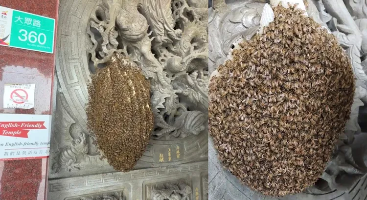 這個蜂窩就在大殿正門入口右手邊,廟方特別設置白板阻擋,做出一定距離隔絕,也提醒信眾避開「請勿動手」,四草大眾廟總幹事王傅誠說,廟宇早年修建時就有蜜蜂前來築巢,之前在藻井處位置較高,進出民眾比較不會注意到,上個月開始蜜蜂開始聚集,沒想到1個月時間就變得這麼大。