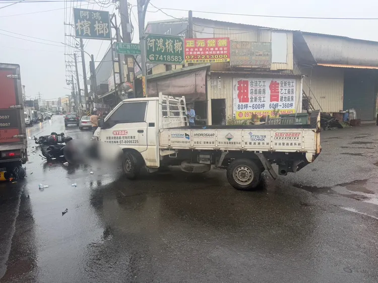 兩部在鳳仁路直行的機車,眼見胡男駕駛的小貨車車頭竄出,想要閃避又怕撞上紀男的貨車車尾,疑似驚慌加上天雨路滑,當場「犁田」自摔,兩車3人重重落地,滑行後仍撞上小貨車。
