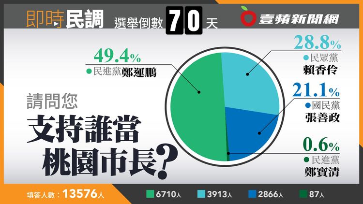 《壹蘋新聞網》昨天(16日)就四位戰將進行網路民調,共1萬3576人參與投票,其中6710人支持鄭運鵬當桃園市長,占49.4%最高;其次為賴香伶的3913人,占28.8%;另2866人選擇張善政、占比21.1%,87人支持鄭寶清、占0.6%。