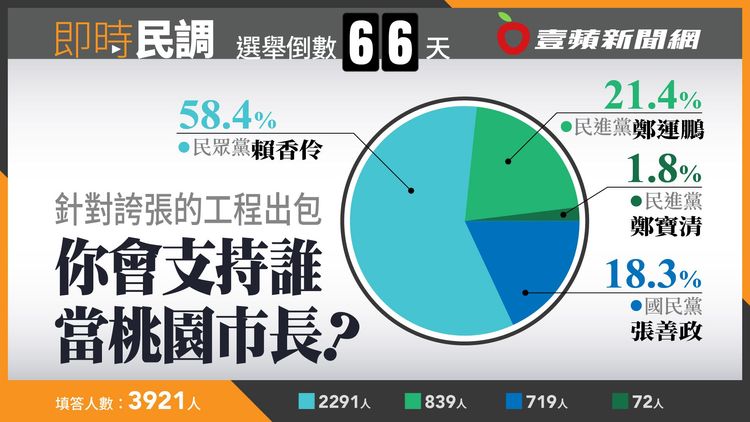 《壹蘋》民調今天網路詢問民眾「針對誇張的工程出包,你會支持誰當桃園市長?」,結果顯示賴香伶獲2291人支持,占比58.4%最高;其次為鄭運鵬21.4%、張善政18.3,及鄭寶清的1.8%。