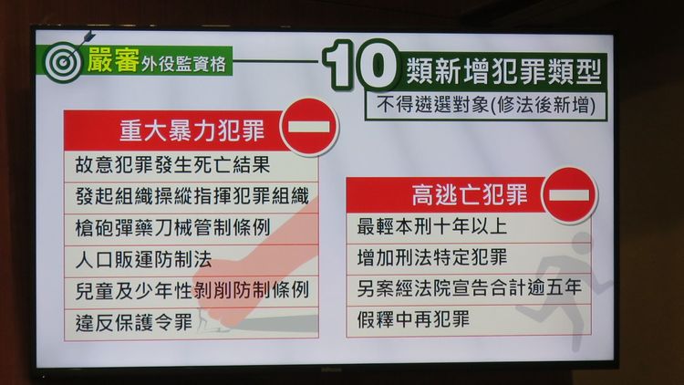 許金標指出,消極條件方面則是擴大既有不得參加外役監遴選的範圍,目前相關遴選排除7類犯罪,修法後,特別針對重大暴力、高逃亡犯罪羅列10類型,不得參與遴選。