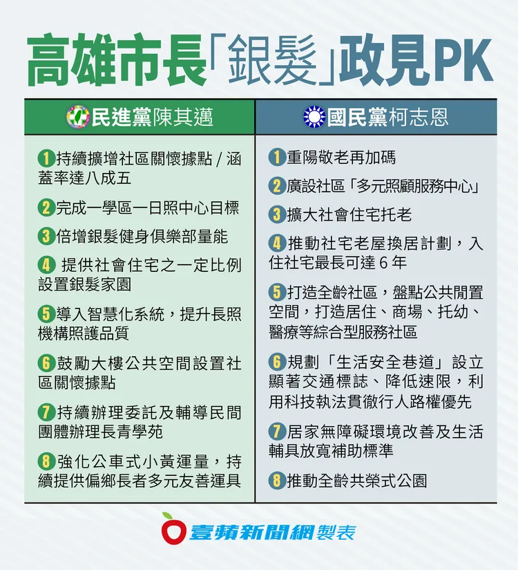 柯志恩則表示,高雄的長照資源仍有分配不均的問題,她若當選將廣設社區「多元照顧服務中心」,建置以「小規模多機能服務中心」為主,一般日照中心為輔的社區照顧服務,以提高服務的可近性,以及社區照顧服務的覆蓋率。