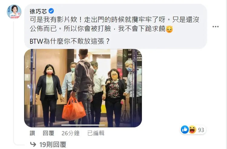 對此,徐巧芯則發文下留言反擊,強調「可是我有影片欸!」走出門的時候就攬牢牢了呀。只是還沒公佈而已。「所以你會被打臉,我不會下跪求饒」,她反問管,「BTW為什麼你不敢放這張?」指明顯拍到陳時中摟肩的照片。