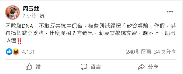 周玉蔻在臉書發文批蔣萬安,不敢驗DNA,不敢反共抗中保台,被曹興誠踢爆「矽谷經驗」作假,「嚇得搞個辭立委牌,什麼爛招?」有骨氣,蔣萬安學姚文智,選不上、退出政壇。