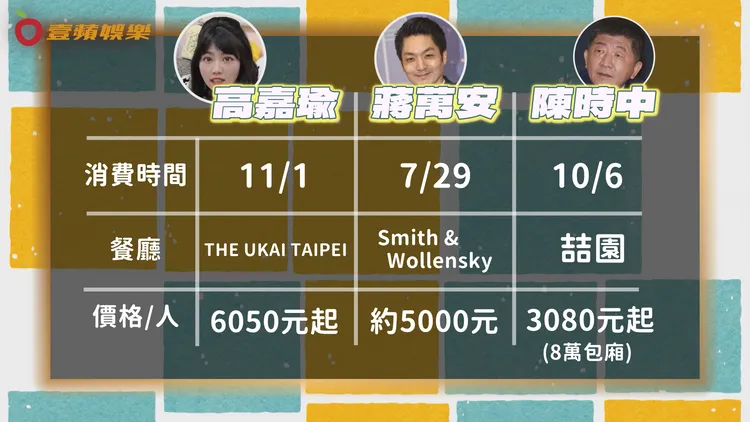 隨後走進微風南山46樓的「THE UKAI TAIPEI」高級夜景餐廳,當日店裡提供日式割烹是無菜單料理,價格含服務費自6050至8470元不等,以高檔鐵板燒及日本料理為主,高嘉瑜被店員帶位進包廂裡頭餐敘,一待就是3個多鐘頭,神神祕祕;晚間接近打烊時間晚上10點多,高嘉瑜終於再度現身,與1女2男同時步出餐廳,一同等電梯。