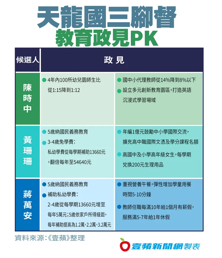 《壹蘋》檢視三人政見,黃珊珊和蔣萬安強攻年輕家長選票,都喊出補助私幼學費,減輕家長經濟負擔,陳時中和黃珊珊也有降低幼兒園師生比的共同政見,但候選人記者會表現落漆,蔣萬安被問倒答不出、轉頭討救兵,遭酸不了解自己的政策。黃珊珊有柯市府教育局長出面背書,被藍綠議員質疑偷懶投機,讓市府公務員幫她寫政策。