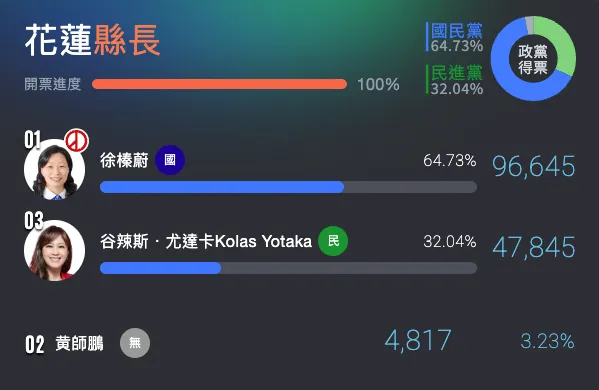 花蓮縣長選戰落幕,國民黨以64.57%得票率,戰勝民進黨Kolas Yotaka(32.15%)當選連任。徐榛蔚今起一連3天將赴各鄉鎮市謝票;敗選的Kolas篤信天主教,今一如往常到天主堂彌撒,表示心情平靜,這段過程讓她感到開心與驕傲。