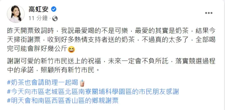 奶茶宣言公布後,27日高虹安進行車掃謝票行程時,沿途許多支持者送上奶茶,替她加油打氣,高虹安也在臉書發文感謝,掃街謝票時,收到好多熱情支持者送的奶茶,不過真的太多了,她笑說「全部喝完可能會胖好幾公斤」,還高EQ強調「奶茶也會請助理一起喝」。