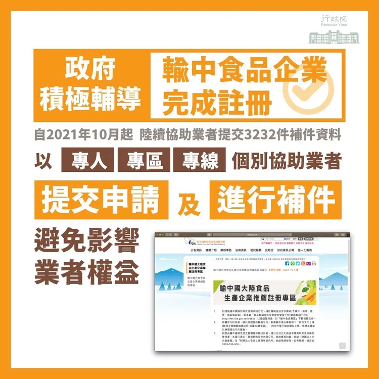 羅秉成指出,衛福部、經濟部、財政部及農委會等相關部會,積極輔導業者進行註冊申請,透過專區(食藥署官網的輸中專區,提供註冊作業流程及常見QA)、專線(設置電話諮詢專線0809-099-908)、專人(業者註冊文件由專人透過兩岸窗口遞交)等方式,協助個別業者提交申請或補件,更委託食品專業背景機構進行業者實地查核及輔導,以避免影響業者權益與輸中食品貿易。