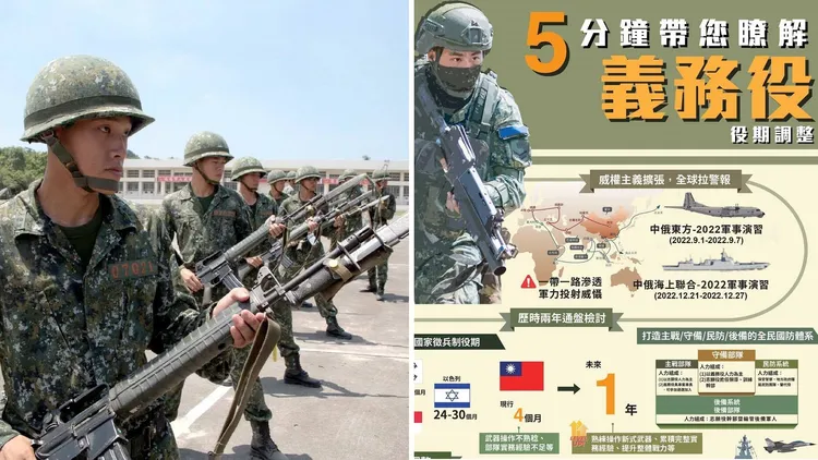 下午蔡英文正式宣布現行義務役期為4個月、替代役6個月,未來役期同樣都會延長為1年,將影響到民國94年次的役男,也就是現在的高三生;蔡英文同時也說明4大兵力結構與明確防衛任務、國軍導入最新模組化訓練模式及義務役士兵月薪調整至26307元。