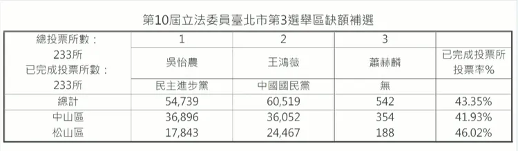 北市立委補選投票率43.35%!吳怡農小輸王鴻薇5780票 關鍵在「這區」