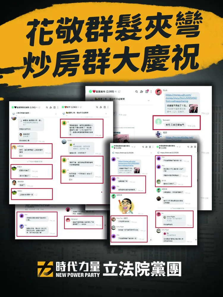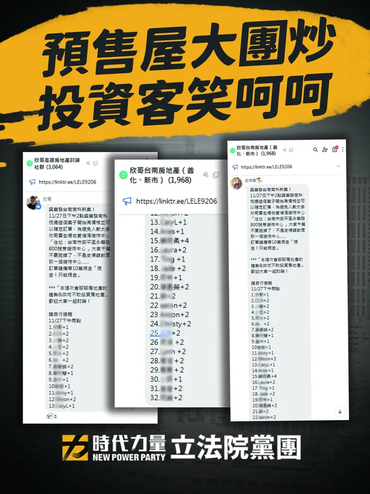 邱顯智指出,投資客群組正大肆慶祝「上路前再漲一波」,更有建商公然宣稱「上半年、日出之前,將有一波絕版可換約預售屋搶購潮」,凸顯行政院、內政部護航建商及投資客到了亡法亂紀的程度,令人感到不齒。