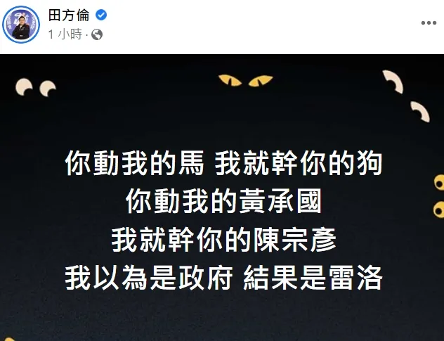 而國民黨青年團總團長、中常委田方倫也不約而同在臉書發文:「你動我的馬、我就X你的狗,你動我的黃承國、我就幹你的陳宗彥,我以為是政府,結果是雷洛」。