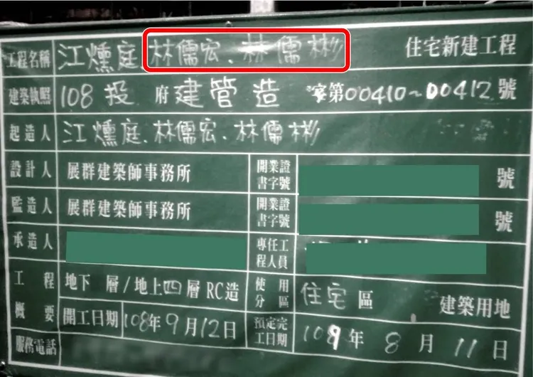 黃建嘉舉出工程告示牌照片,顯示該新建工程案從2019年9月12日開工,2020年8月11日預定完工,江燻庭、林儒宏、林儒彬掛名起造人。