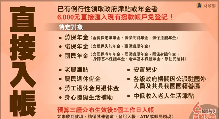 若已有例行性領取政府津貼或年金者,6000元會直接匯入現有撥款帳戶免登記,包括已例行性領取勞保、職保、國民年金,及老農津貼、安置兒少、農民退休儲金、勞工退休金月退休金、各及政府機關因公派駐國外人員及其具我國國籍眷屬、身心障礙生活補助、中低收入老人生活津貼者,發放日期在預算三讀公布生效後5個工作日入帳。